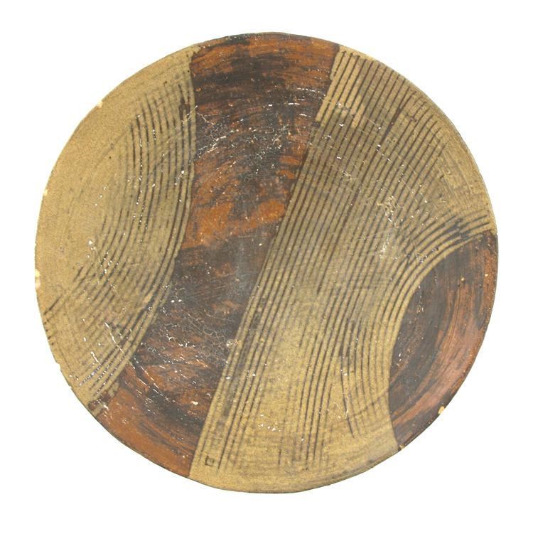 a stoneware charger, resist decorated with geometric design, unsigned, minor rim chips 38.5cm. diam.