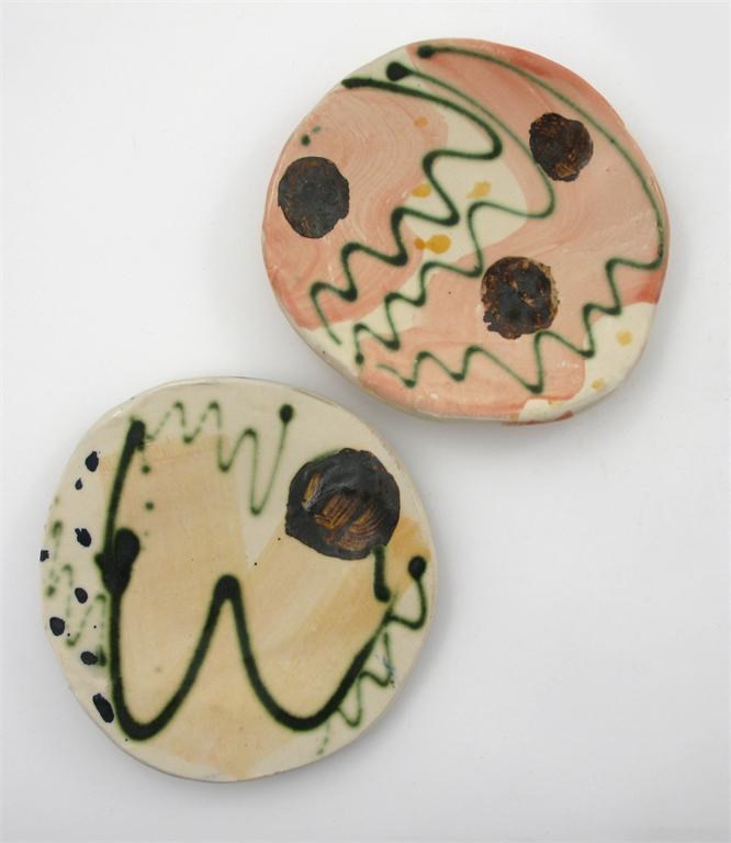 a pair of earthenware platters, slip decorated in colours one signed in slip to reverse 21cm. wide