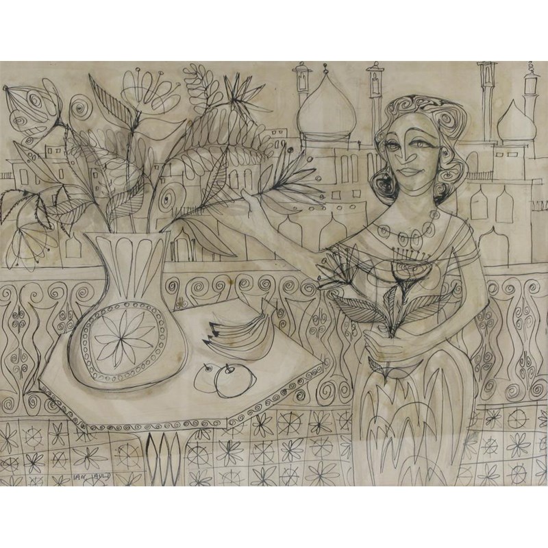 an ink, pen and wash picture of a woman arranging flowers, on paper, framed signed in pen 50 x 37cm.