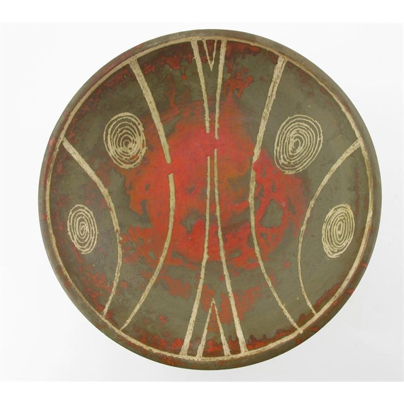 A large Crosskeys Pottery stoneware charger, resist decorated with a geometric design in shades of olive and red, circa 1955 impressed pottery mark, applied paper label 42cm. diam.