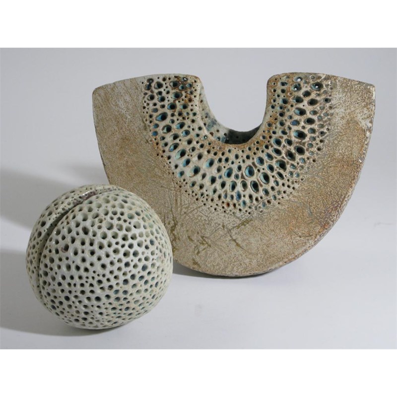 a split ovoid vase, glazed off white with blue and lavender internal glaze, and a segment vase incised AW 13cm. high