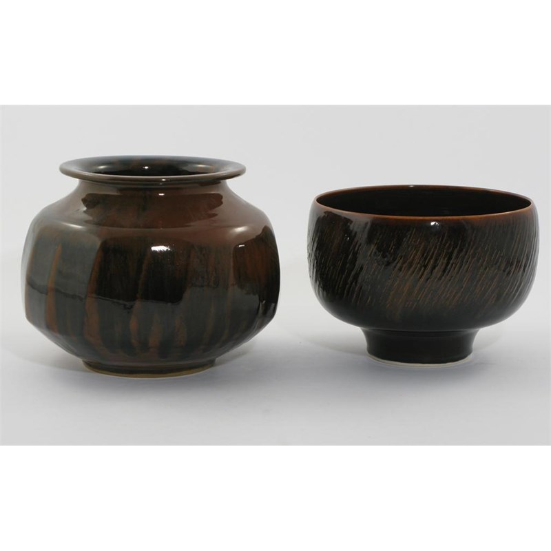 a cut sided vase, with everted rim, covered in a mottled brown glaze, and a bowl similar impressed marks 19.5cm. high