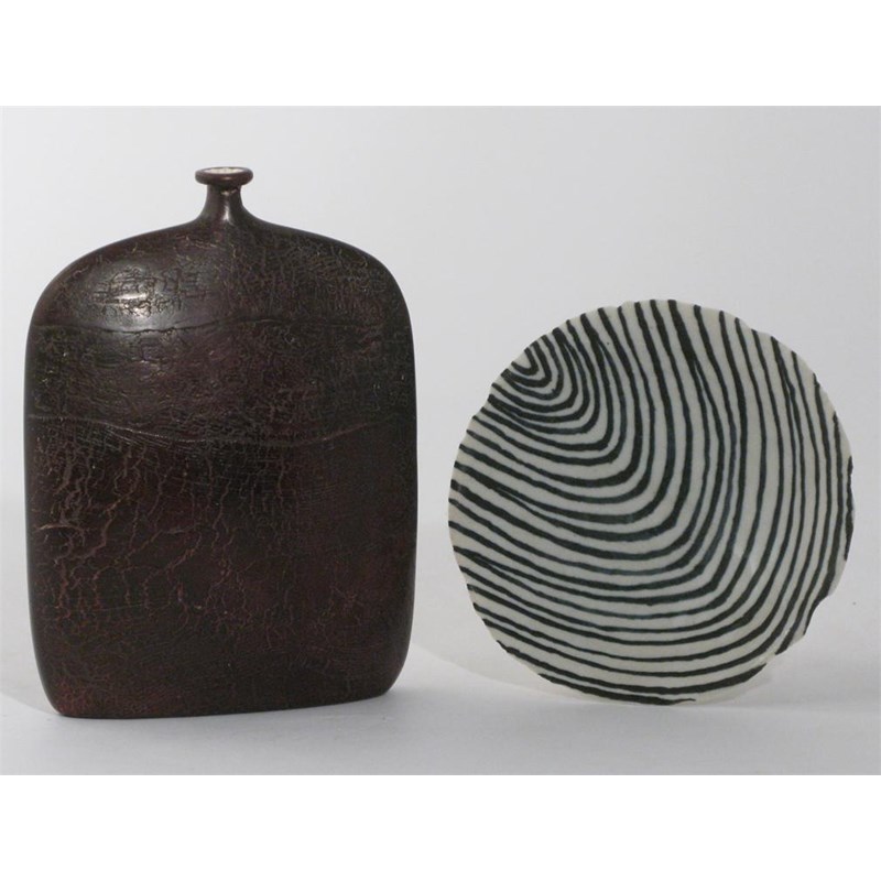 a raku bottle vase, covered in a burnt umber glaze, and a Derek Davis stoneware dish incised signature, paper label 1985, repaired neck 20cm. high