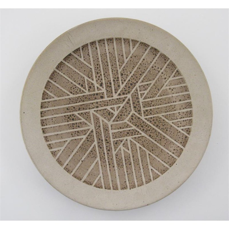 Chris Jenkins (b.1933) a pottery plate decorated to the well with geometric design impressed seal...