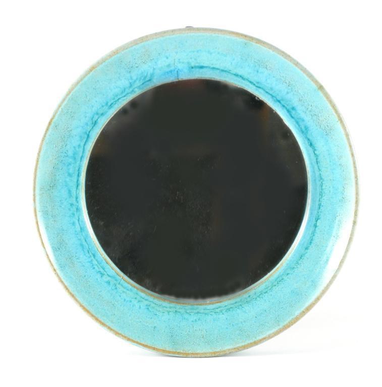 a rare stoneware wall mirror covered in a turquoise glaze impressed LR seal mark, circa 1940's 17.5 cm. diam.