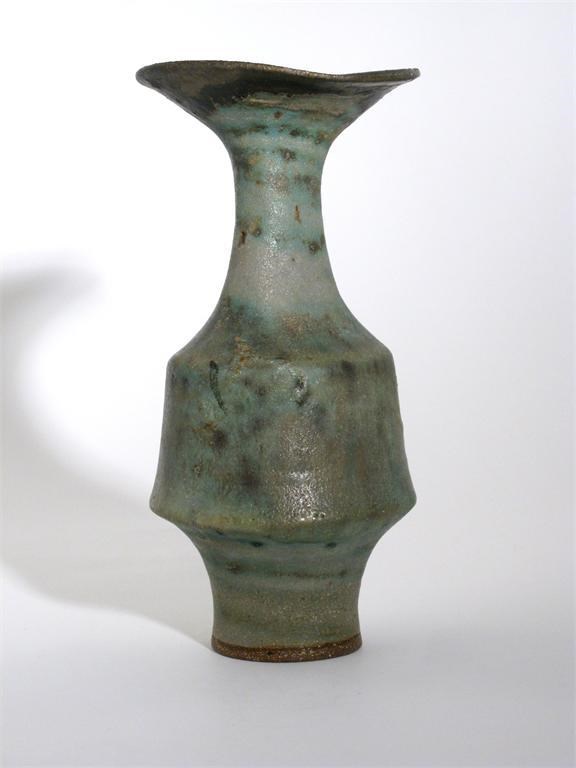 a stoneware bottle vase with flattened flaring neck, turquoise with blended spots of brown, with bronzed rim impressed seal mark 27cm. high