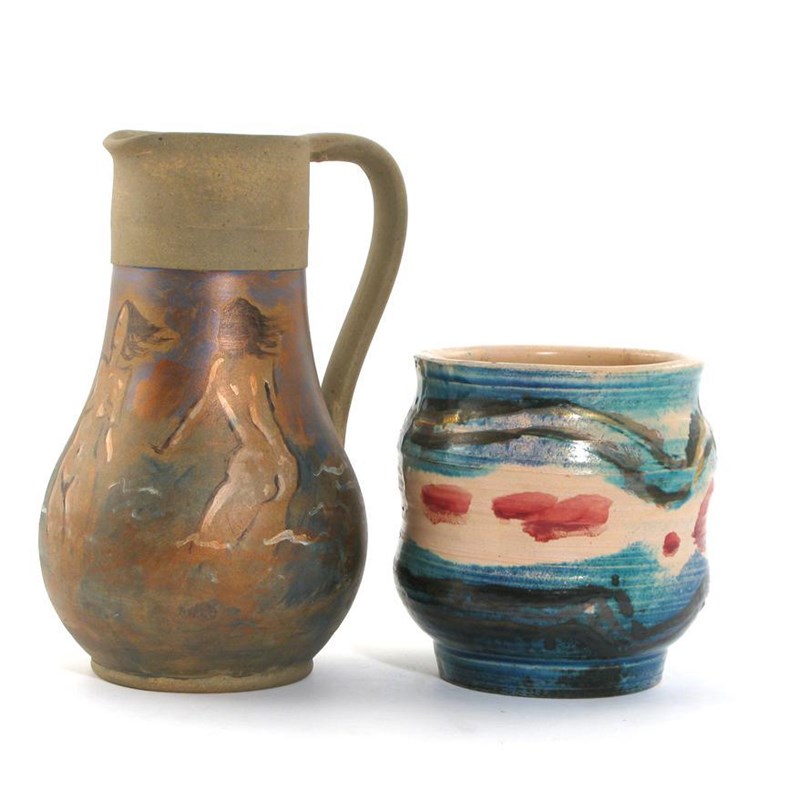 a  Fulham Pottery vase, painted with geometric panels, and a Fulham Pottery Hurlingham Ware jug by S Cooper, painted with bathers impressed marks, impressed marks, painted signature 15cm. high