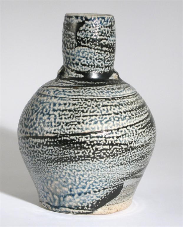a salt-glazed stoneware vase, ovoid with collar rim and small applied handles, two Poole Pottery bowls designed by Sally Tuffin, an Okra glass vase and two other items impressed seal mark 25cm. high
