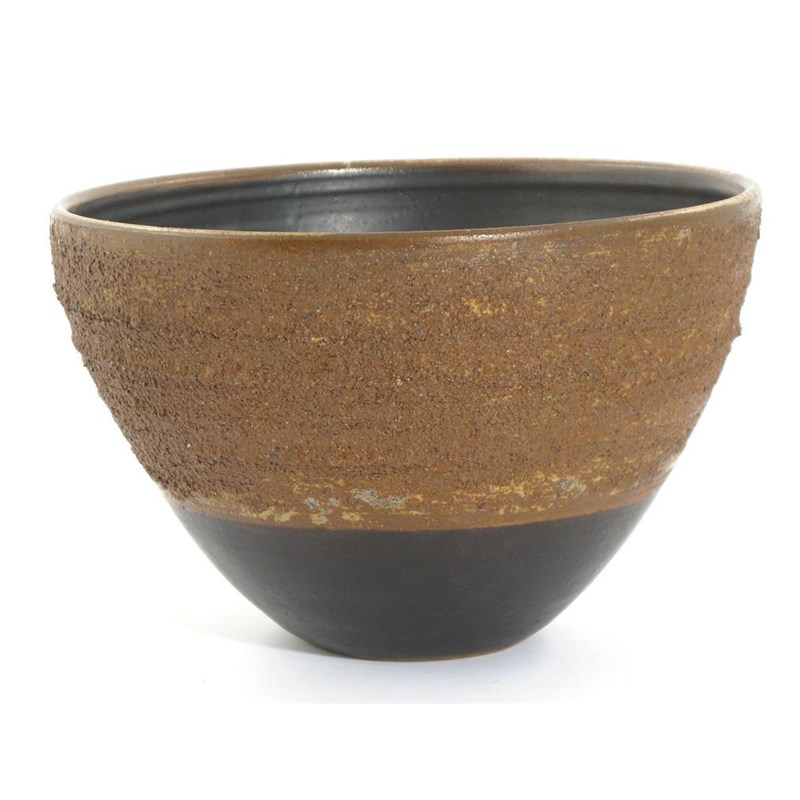 a large flaring stoneware bowl, the exterior spray glazed with a textured brown glaze over black band, the interior glazed blue impressed seal mark 20.5cm. high