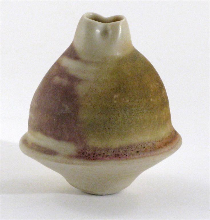 a miniature porcelain form, pinched rim glazed burgundy and buff incised S 6cm. high