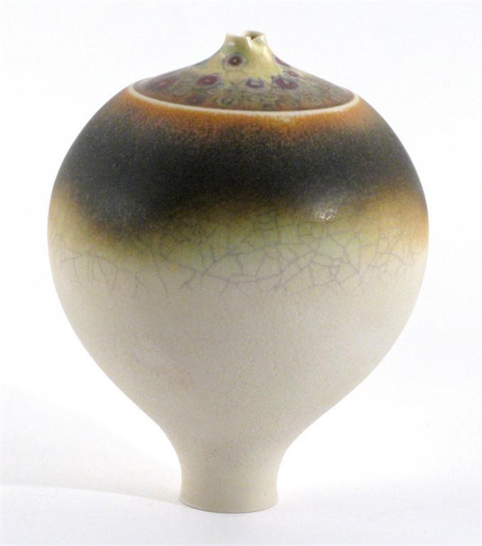 a tall porcelain form, ovoid body with pinched aperture, spray glazed yellow, burgundy and rust incised S 12.5cm. high