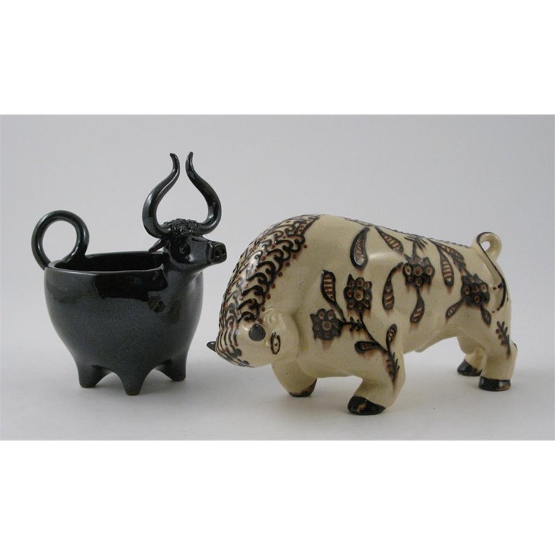 A Hastings Pottery model of a bull, glazed brown, and a slip decorated bull impressed marks 18cm. wide