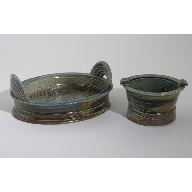 a salt-glazed stoneware twin-handled dish, oval form, with loop handles, and another Jane Hamlyn pot impressed seal marks 24cm. wide