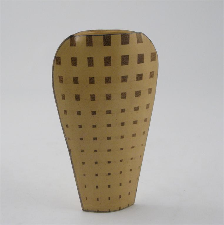 a slab built vase, elliptical form, stencil decorated with graduated brown squares unsigned 22cm. high