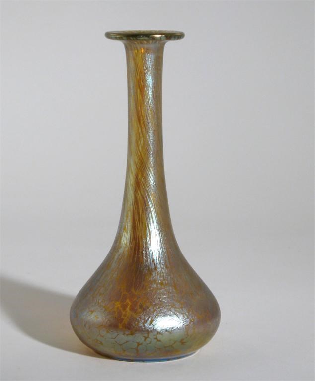 A Loetz glass vase ovoid with tapering neck and everted rim, covered in a splashed golden iridescence unsigned 22cm. high