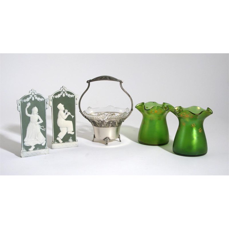A pair of Austrian Iridescent glass vases, decorated in gilt, a glass flower trough and three other items unmarked 10.5cm. high