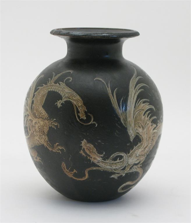 A Martin Brothers stoneware vase ovoid, incised with fighting dragons, in shades of ochre on a deep brown ground incised 6-1898, Martin Bros London & Southall, repaired section to neck 23cm. high