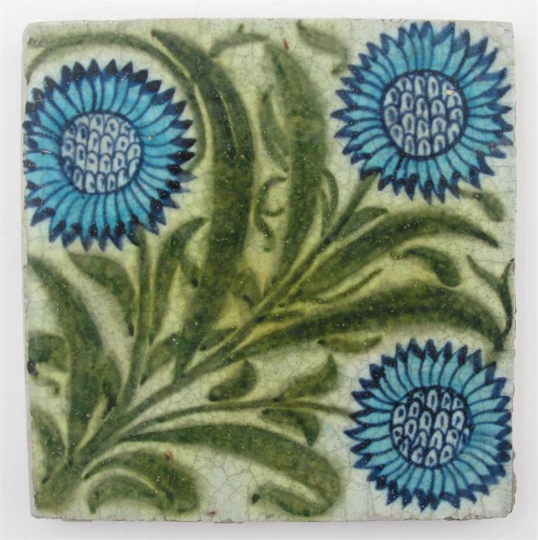 A William De Morgan tile painted with three blue sunflowers, in blue and green on a white ground unmarked 15.5cm. square