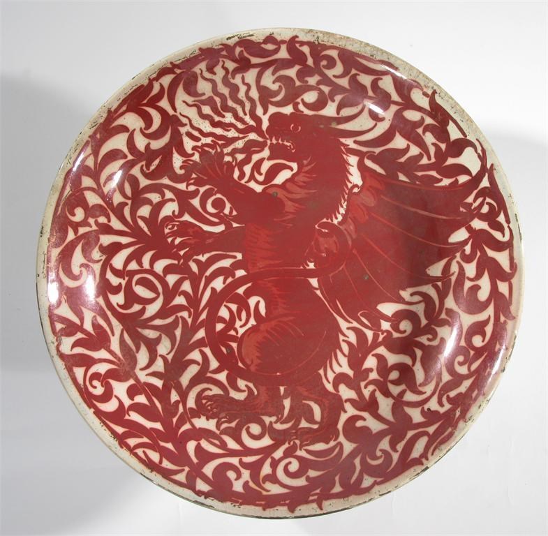 A William de Morgan ruby lustre charger painted with a fire breathing lion unsigned hairline to rim 34 cm. diam