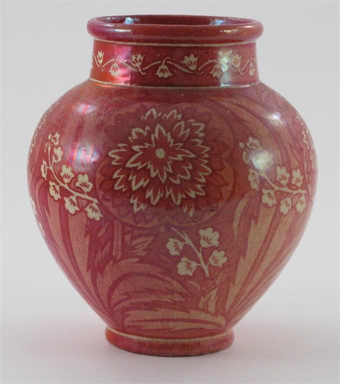 A Maw & Co pottery vase ovoid with collar rim, painted with stylised flowers in ruby and pink lustre painted Maw Ltd  Jackfield 23cm. high