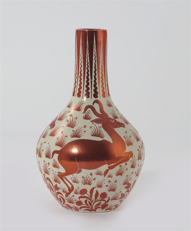 A William De Morgan stoneware bottle vase by Joe Juster, painted in ruby lustre with a frieze of leaping gazelle, on a white ground painted Fulham JJ 2402 25cm. high