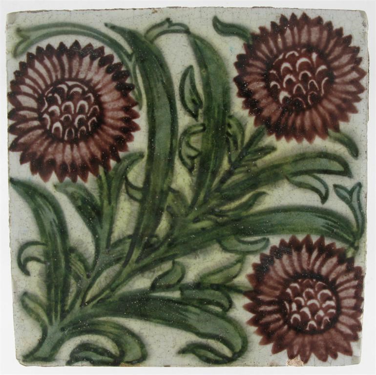 A William De Morgan Chelsea Period tile painted with three sunflowers in aubergine and green on a white ground impressed mark, minor rim fills 15.5cm. square