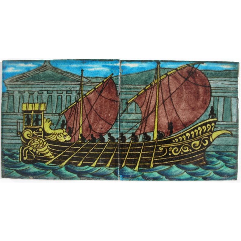 A William De Morgan Merton Abbey two tile galleon panel painted with a ship at sail before a classical temple in shades of blue, green, aubergine and yellow, framed impressed Merton Abbey mark 30.5 cm. wide