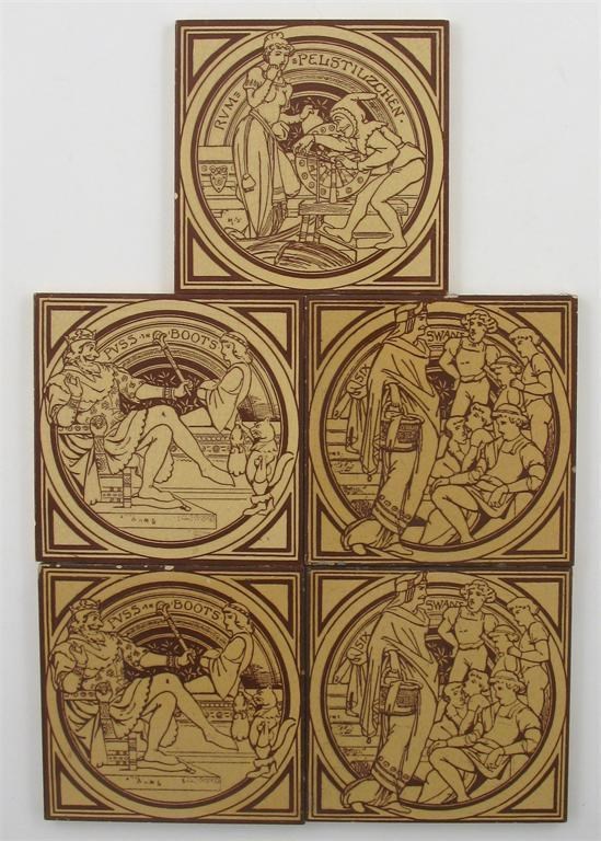 'Fairy Tales' five Minton pottery tiles, designed by John Moyr Smith, in brown on a cream ground impressed marks 15.5cm. square