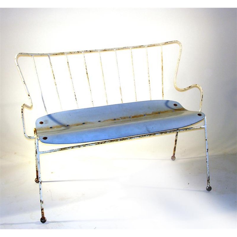 An 'Antelope' two seat chair designed by Ernest Race for the Festival of Britain, wirework frame with metal ball feet and sky blue painted fibreglass seat 102cm. wide