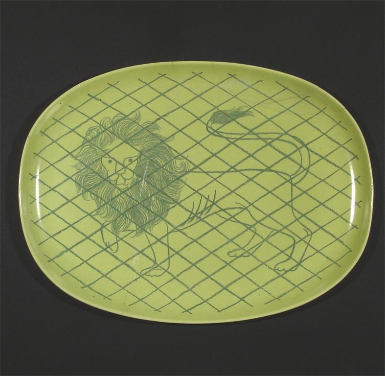 'Leo' a Poole Pottery Studio plate by Ann Read, painted with a lion on a vivid yellow ground printed and painted marks, re-stuck damages 36cm. wide Provenance Roy Holland, managing Director of Poole Pottery, thence by descent Literature Leslie Hayward & Paul Atterbury Poole Pottery Richard Dennis Publications, page 105 for another example illustrated