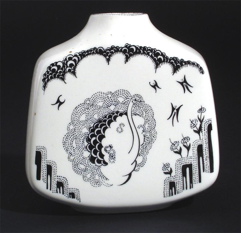 A Poole Pottery prototype Aubrey Beardsley Ware vase shape no.35, painted by Susan Pottinger, with a peacock and butterflies in black on a white ground printed and painted marks 10.5cm. high  Provenance Roy Holland, managing Director of Poole Pottery, thence by descent