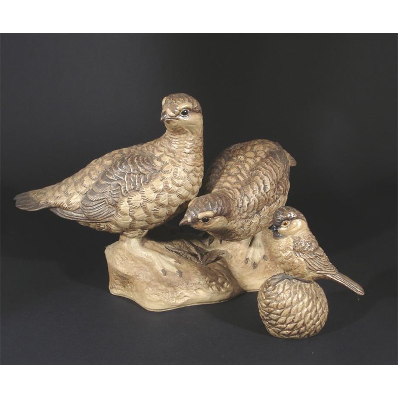 A Poole Pottery stoneware Grouse group designed by Barbara Linley Adams, and a bird on a pinecone group impressed and printed marks, chip to tail of grouse 33cm. wide.  These figures were additional to the limited edition of 1000 and are believed to be the first figures produced  as test pieces  Provenance Roy Holland, managing Director of Poole Pottery, thence by descent
