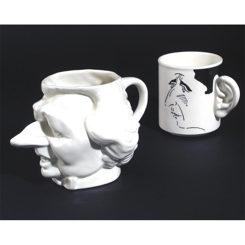 A Margaret Thatcher character mug designed by Peter Fluck and Roger Law, dated 1983, and a Carlton Ware mug depicting Prince Charles, from a design by Marc various marks 11cm. high  The Margaret Thatcher mug is based on the Spitting Image model.  Spitting Image, the satirical television programme, ran from 1984 to 1996.