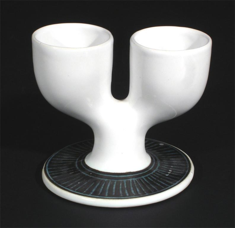 A Troika Pottery white Double Egg cup glazed white with blue and black band  printed mark 9cm. high