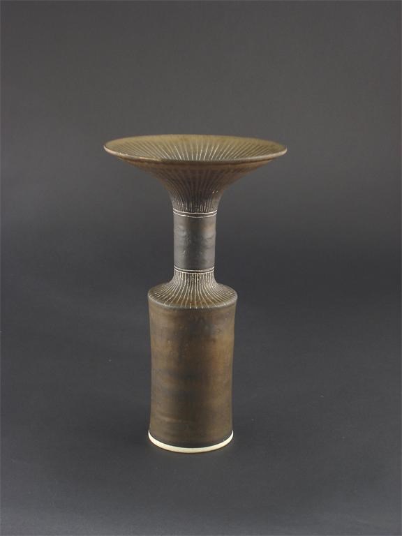 A Lucie Rie porcelain bottle vase slightly waisted cylindrical body with broad flaring neck, bronze glaze with sgraffito bands to neck and shoulder impressed seal mark 22.5cm. high  Provenance New Craftsman, St Ives 1988.