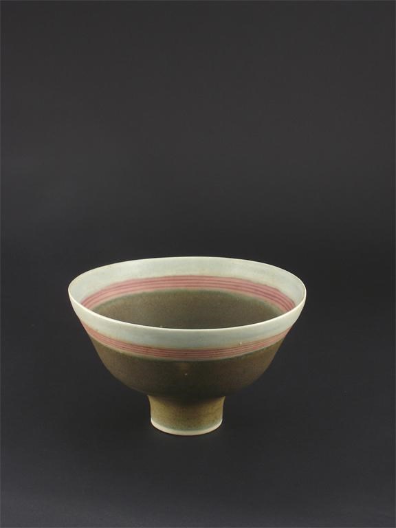 A Lucie Rie porcelain bowl flaring pedestal form, the pale blue rim with pink band and mottled brown body impressed seal mark 18.4cm. diam.  Provenance Purchased from Lucie Rie, Albion Mews, directly in the 1980's.  Literature Garth Clark The Potters Art, Phaidon, page 166 for a comparable bowl