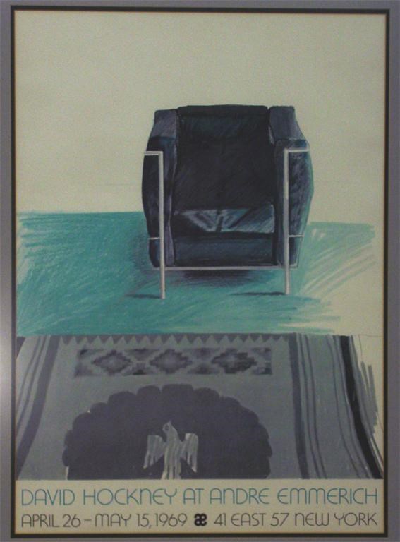 'Corbusier Chair and Rug - David Hockney at Andre Emmerich' a poster designed by David Hockney for Andre Emmerich, New York, 1981, framed image size 70 x 49.5cm. Literature Off the Wall, Hockney Posters Pavilion catalogue number 23