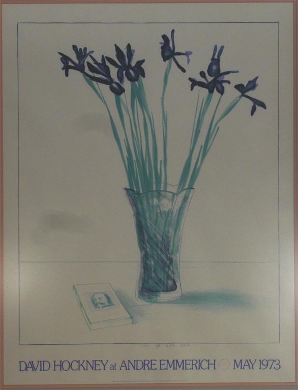 'Still Life with Book - David Hockney at Andre Emmerich' a poster designed by David Hockney for Andre Emmerich, New York, 1973, framed image size 81 x 62cm Literature Off the Wall, Hockney Posters, Pavilion Books, catalogue number 56
