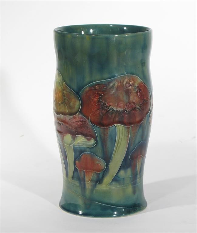'Claremont' a Moorcroft Pottery vase designed by William Moorcroft, made for Liberty & Co, painted in colours on a streaked  green ground printed Liberty mark, painted green signature, professionally restored  20cm. high