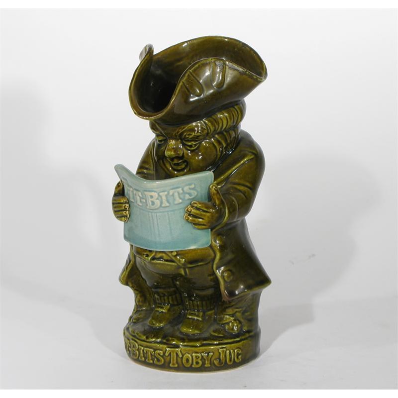 'Tit-bits Toby Jug' an Ault pottery toby jug modelled as a man in tricorn hat seated, reading the 'Tit-bits' paper, glazed green and blue, dated 1917 impressed and printed marks, minor chips 23cm. high