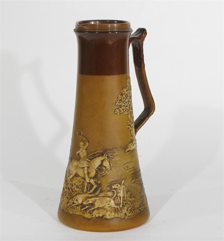 A Royal Doulton stoneware jug cast in low relief with a hunting scene, in shades of brown impressed marks 27cm. high