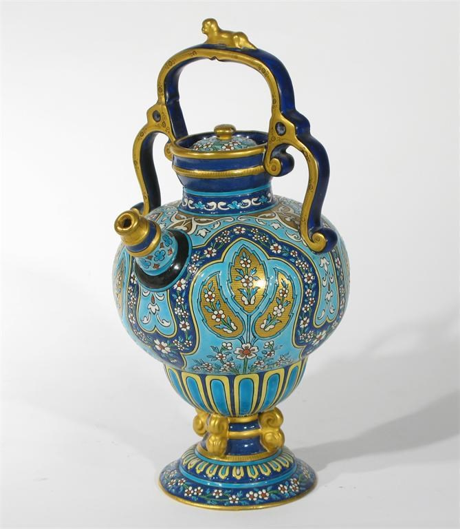 A continental pottery ewer and cover probably Longwy, enamelled in colours with Persian floral cartouche, the stepped handle surmounted with a resting dog, highlighted in gilt unsigned, professional restoration to the neck 26cm. high