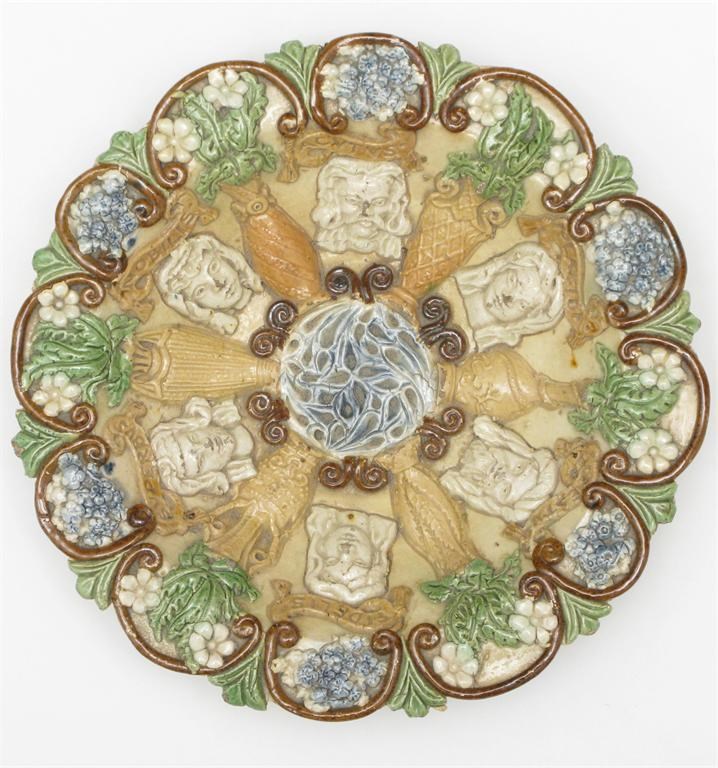 A Castle Hedingham Pottery wall plate cast in low relief a frieze of portraits and flower-filled urns, in shades of brown, blue and green on a buff ground impressed castle mark, minor glaze chips 24cm. diam.