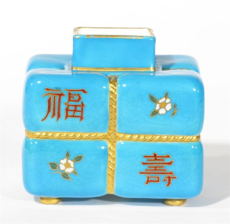 A Minton Pottery tea caddy the design attributed to Dr Christopher Dresser, rectangular section modelled as a rope bound package, glazed blue with Chinese character and flowerhead decoration unsigned, glaze flakes 10cm. high
