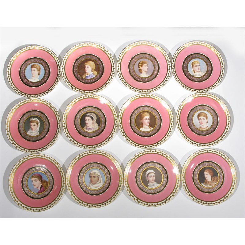 A set of twelve Aesthetic Movement Minton plates each painted with a medieval portrait, possibly painted by Mary Gladstone, in colours inside enamelled white beadwork and a pink border, the rim with a band of gilt foliage printed mark, impressed marks 24cm. diam.