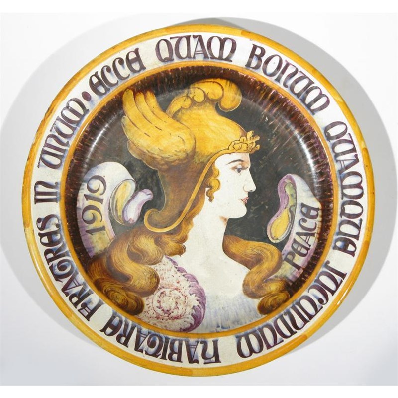 'Peace - 1919' a Wedgwood commemorative charger painted in colours, the rim with inscription, the well a bust of a Britannia, made for Soane & Smith Ltd impressed and printed marks, 43cm. diam. Literature Maureen Batkin Wedgwood Ceramics 1846-1959, Richard Dennis Publications, page 10 colour plate IX for a comparable example. This charger, one of a set of three, was produced in a limited edition of 250.