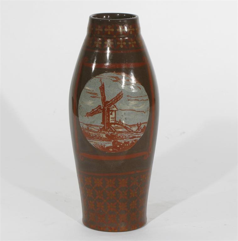 A Mintons Pottery vase printed and painted in red and white with Dutch scene roundels, on a brown ground impressed marks, 3331 painted B 20.5cm. high