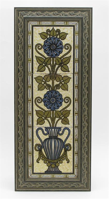 A Maw & Co Aesthetic Movement three tile panel printed in colours with stylised flowers in a vase, in green and blue, framed impressed marks to the tiles each tile 20.5cm square