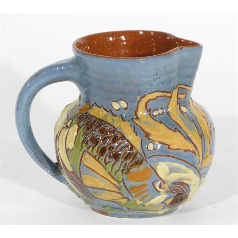 A C H Brannam Pottery jug ovoid with collar rim, incised and painted with scaly fish and a motto, in shades of blue, green and ochre, incised marks, dated 1901 incised marks, minor nicks 12.5cm. high
