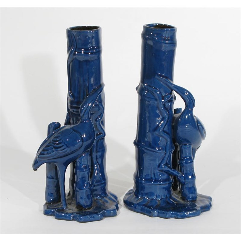 A pair of C H Brannam Barum Ware spill vases each modelled as a stork standing by a large bamboo stem, glazed blue incised marks 23.5cm. high